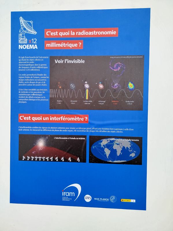 Le site comporte 12 télescopes de 15 m de diamètre chacun capables d’enregistrer les ondes de l’ordre du millimètre, et donc d’étudier des objets froids. Les antennes sont déplaçables et permettent d’avoir un diamètre maximum d’éloignement de 1664 m, ce qui permet d’augmenter la qualité des données collectées (d’où le nom d’interférométrie). Des projets sont même menés en utilisant tous les télescope mondiaux pour avoir un diamètre de 12000km. C’est ainsi qu’a été obtenue l’image du trou noir en 2019 grâce à une coopération internationale.